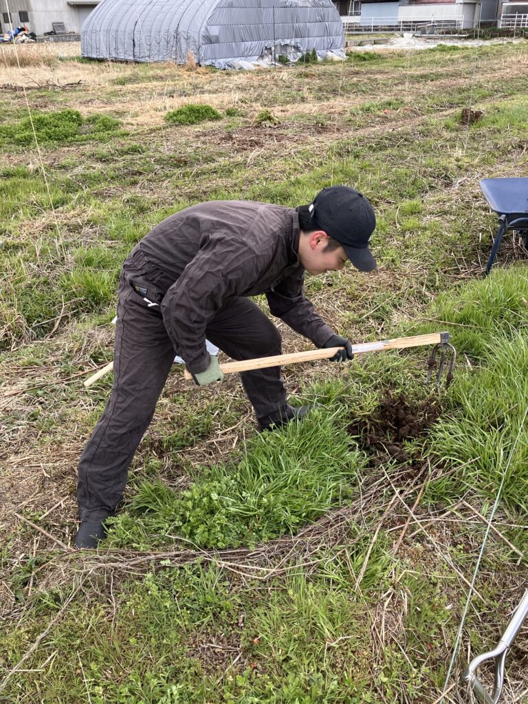 まず行ったのが、土の掘り起こし。クワを手に、苗が根を張りやすいよう丁寧に土をほぐしていきます。