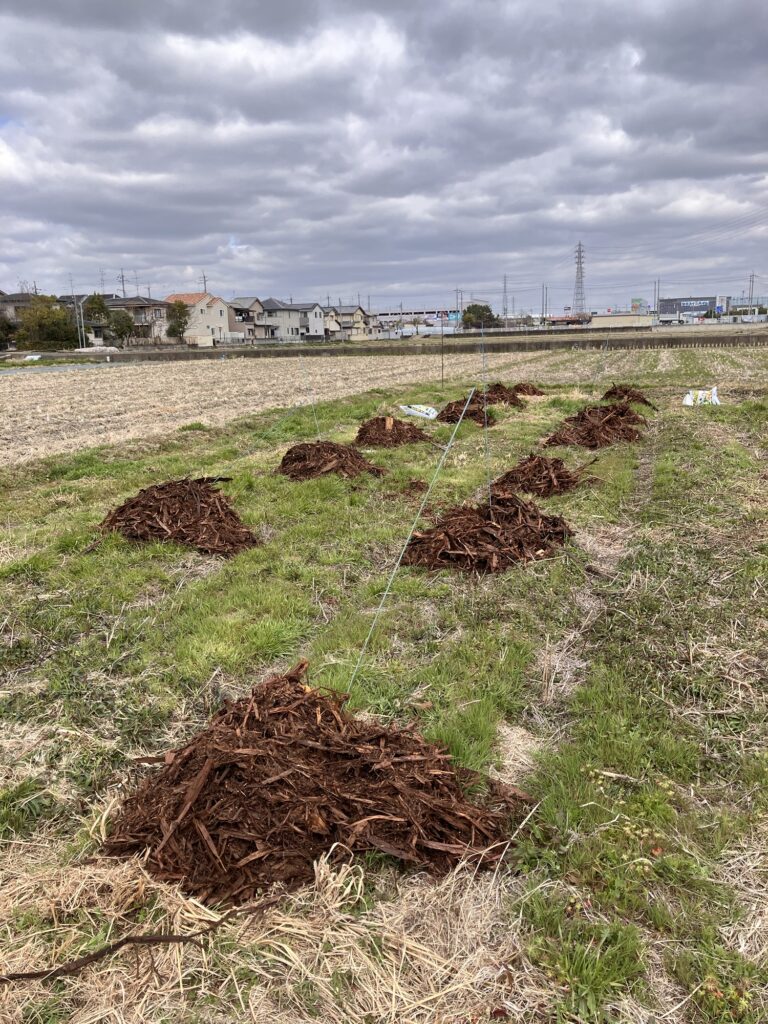 次に行ったのがバークチップのマルチング。苗の根元にバークチップ(木材チップ)を敷くことで、
